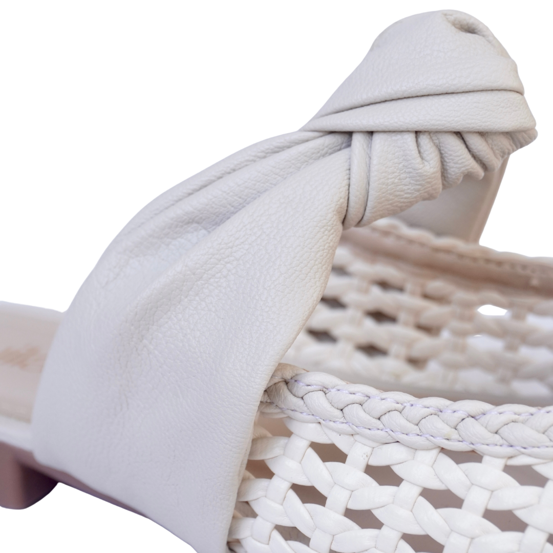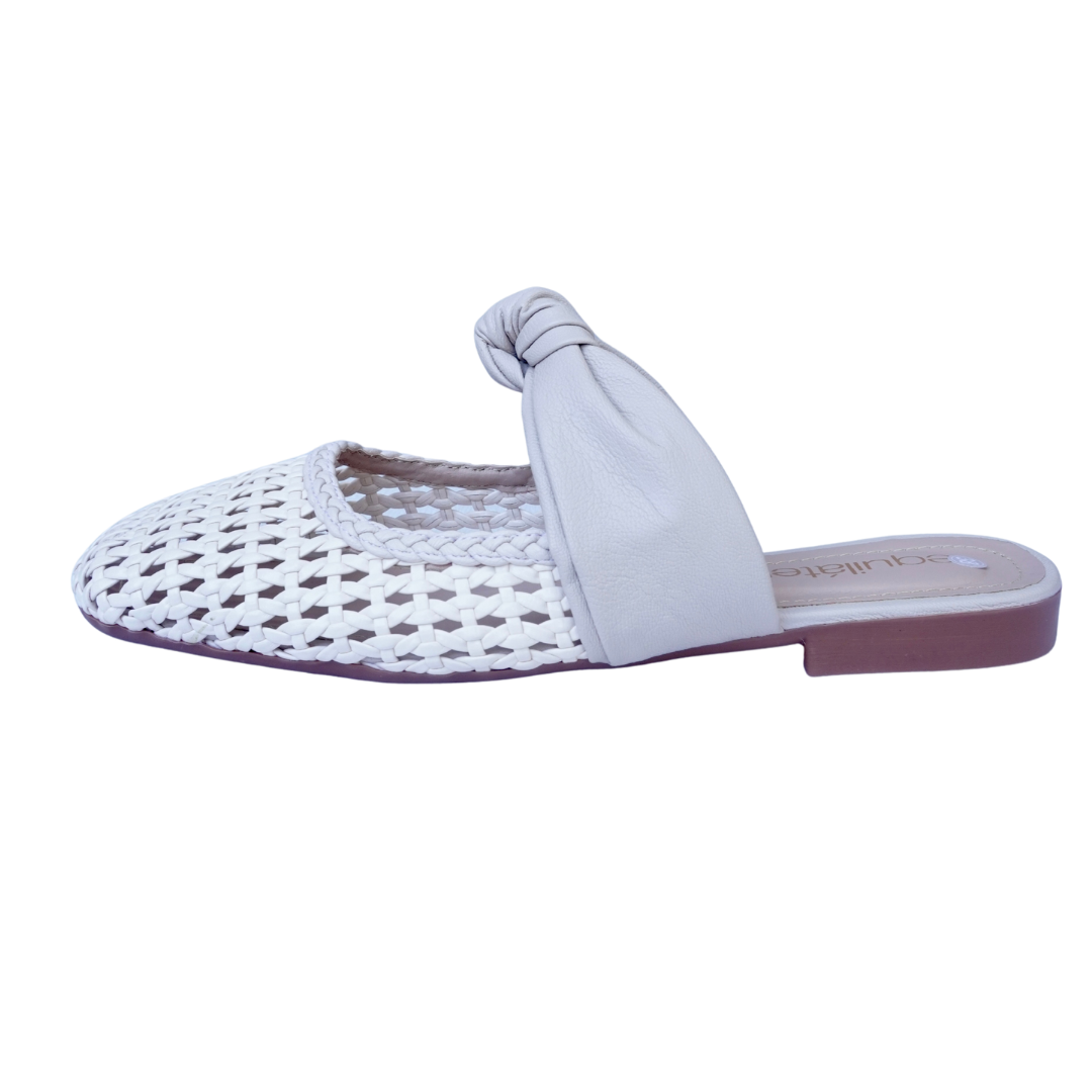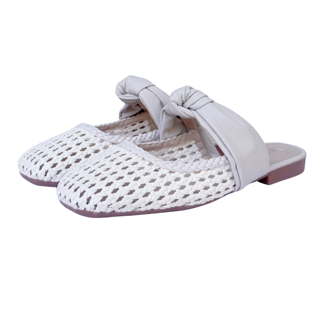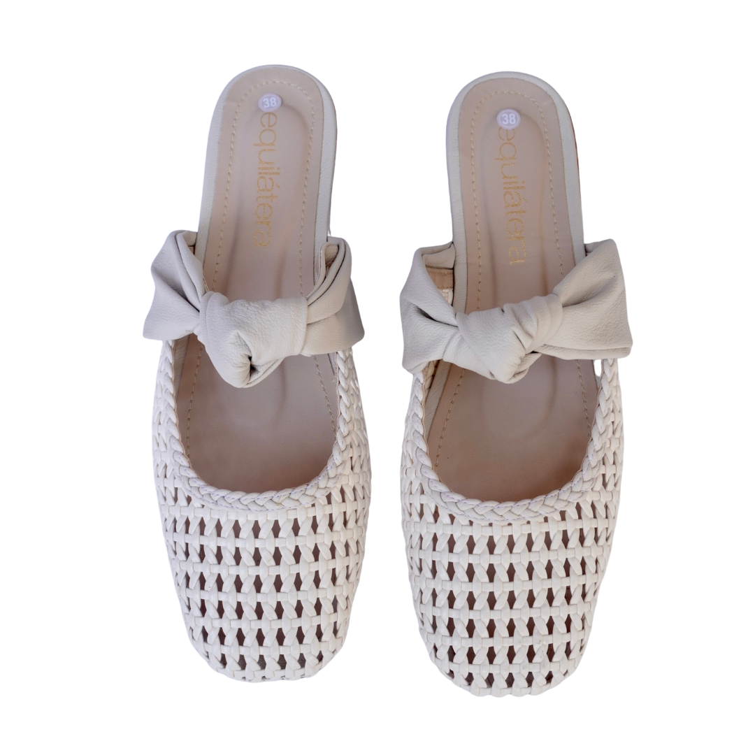 Mules en tono hueso con un delicado trabajo tipo cestería que aporta textura y distinción. El detalle de nudo en el empeine añade un toque femenino y actual, creando un equilibrio perfecto entre encanto natural y elegancia contemporánea.