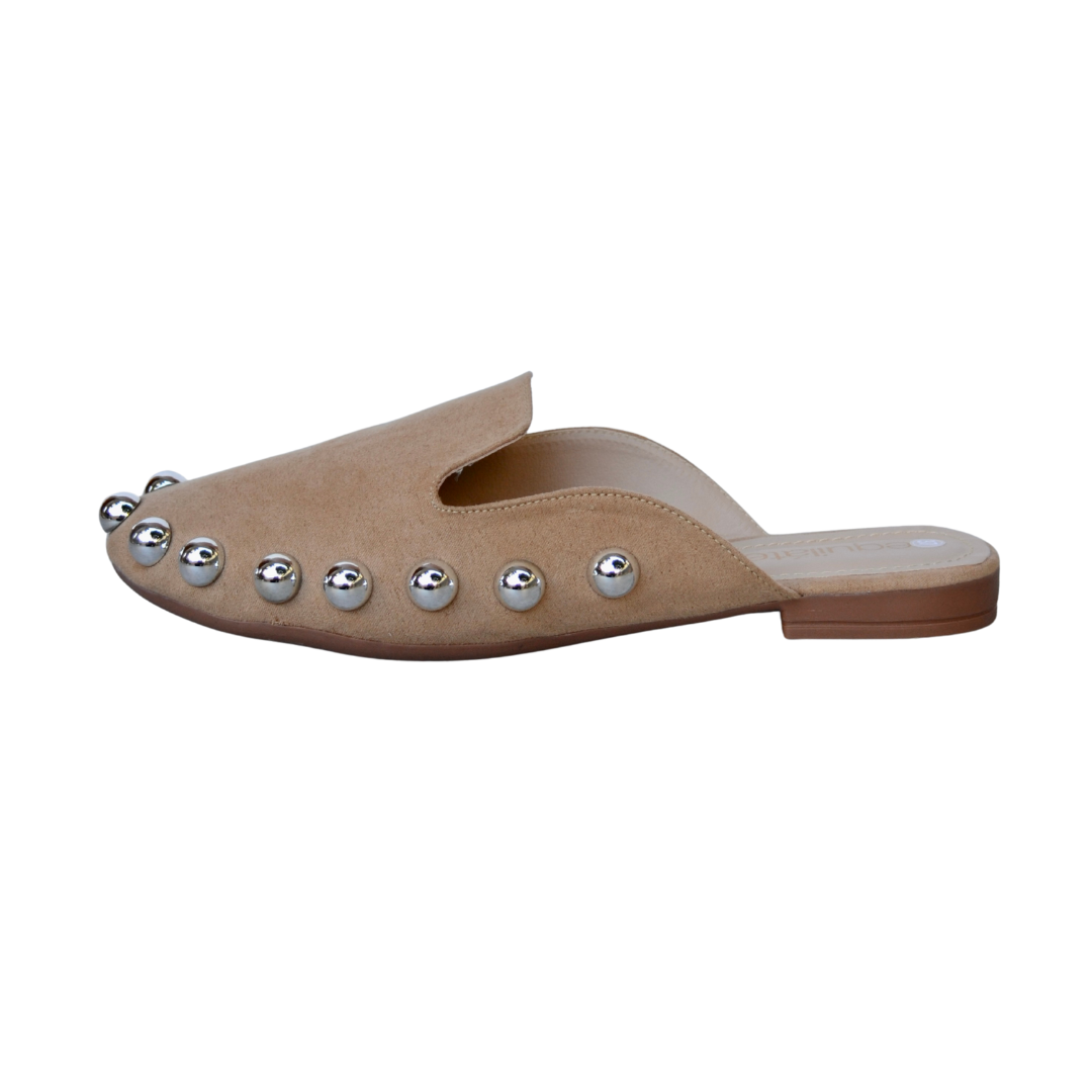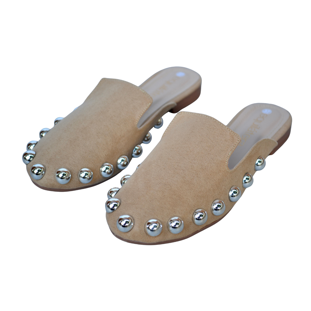 Este sueco en suave suede arequipeños, combina calidez y carácter en un diseño super cómodo. El detalle de tachas plateadas tipo pepas que recorre todo el borde del zapato aporta un toque audaz, elevando su esencia casual con un guiño contemporáneo. Ideal para looks relajados con mucha personalidad.